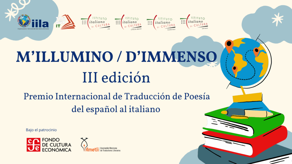 La IILA, junto a los Institutos Italianos de Cultura de Ciudad de México, Lima, Montevideo y Santiago de Chile, y el Laboratorio Trādūxit, premiarán la tercera edición del Premio Internacional de Traducción de Poesía M’ILLUMINO / D’IMMENSO, que reconocerá la mejor versión al italiano de poemas de Eduardo Hurtado (México) y Rossella Di Paolo (Perú). Además, contaremos con el recital de ambos poemas.