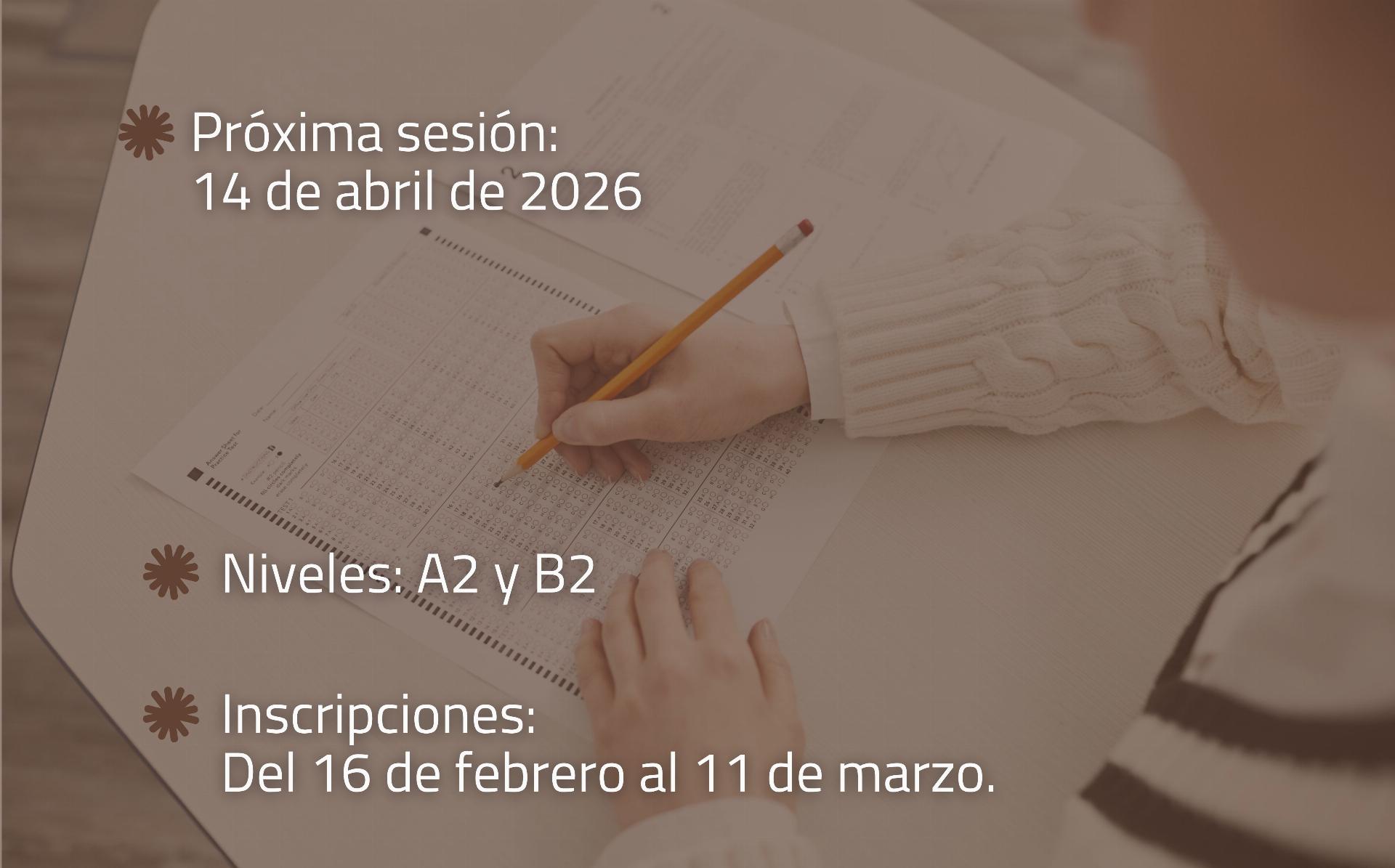 Próxima sesión: 14 de abril de 2026 (niveles A2 y B2). Inscripciones del 16 de febrero al 11 de marzo.