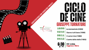 Un ciclo dedicato a Giuseppe Tornatore, maestro del cinema italiano contemporaneo e vincitore dell’Oscar per Cinema Paradiso. I suoi film esplorano la memoria, l’identità e la complessità delle relazioni umane, con uno stile narrativo inconfondibile. 📅 Programma 9 ottobre – Stanno tutti bene (1990) Tutte le proiezioni si terranno presso l’Istituto Italiano di Cultura di Lima, alle […]