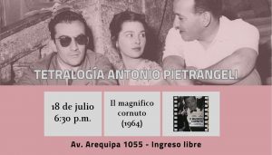 Il terzo film della Quadrilogia di Antonio Pietrangeli è Il magnifico cornuto, una meravigliosa commedia con Claudia Cardinale, Ugo Tognazzi e Gian Maria Volontè. Andrea Artusi è geloso e sospettoso a tal punto che sua moglie Maria Grazia deve inventarsi il nome di un finto amante. Un grande classico del cinema italiano. Vi aspettiamo all’Istituto […]