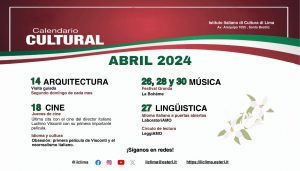 L’Istituto Italiano di Cultura di Lima organizza una visita guidata all’edificio dell’Istituto Italiano di Cultura, costruito tra il 1929 e il 1930, riconosciuto come centro della vita culturale della Comunità Italiana e Patrimonio Culturale della Nazione. La visita sarà accompagnata dalla direttrice dell’Istituto, la Dott.ssa Silvia Vallini, Specialista in Storia dell’Arte. Vi aspettiamo domenica 14 aprile 2024 alle 10:00 […]