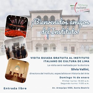 L’Istituto Italiano di Cultura di Lima organizza una visita guidata all’edificio dell’Istituto Italiano di Cultura, costruito tra il 1929 e il 1930, riconosciuto come centro della vita culturale della Comunità Italiana e Patrimonio Culturale della Nazione. La visita sarà accompagnata dalla direttrice dell’Istituto, la Dott.ssa Silvia Vallini, Specialista in Storia dell’Arte. Vi aspettiamo domenica 14 gennaio […]